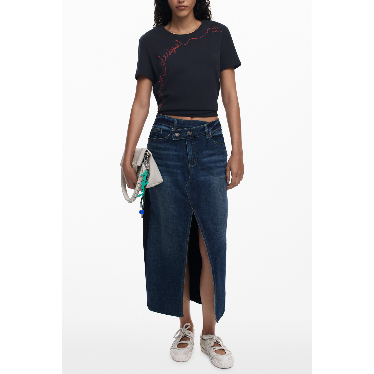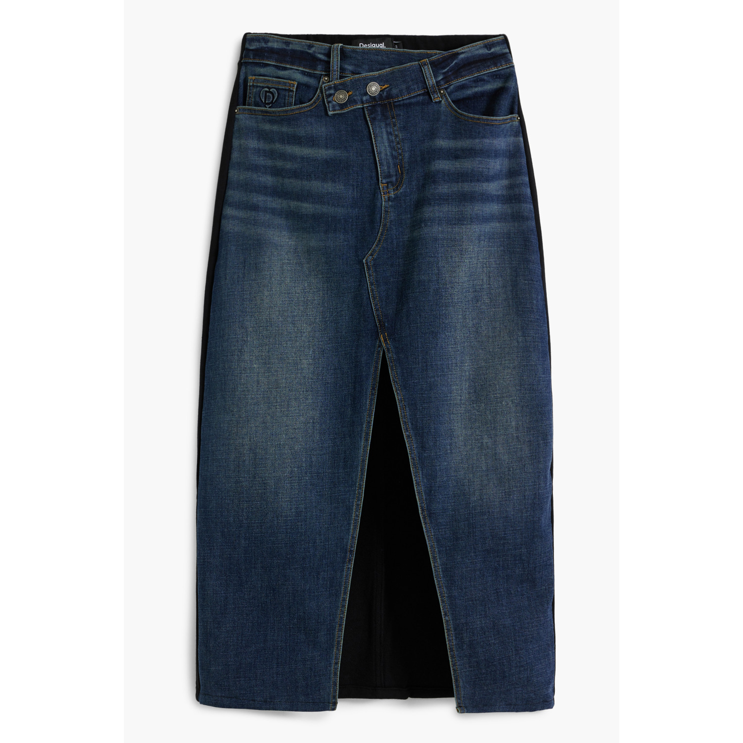 GONNA LONGUETTE IN JEANS, TWISTED, 4 TASCHE, DETTAGLI A CONTRASTO, BOTTONI E ZIP, LOGO